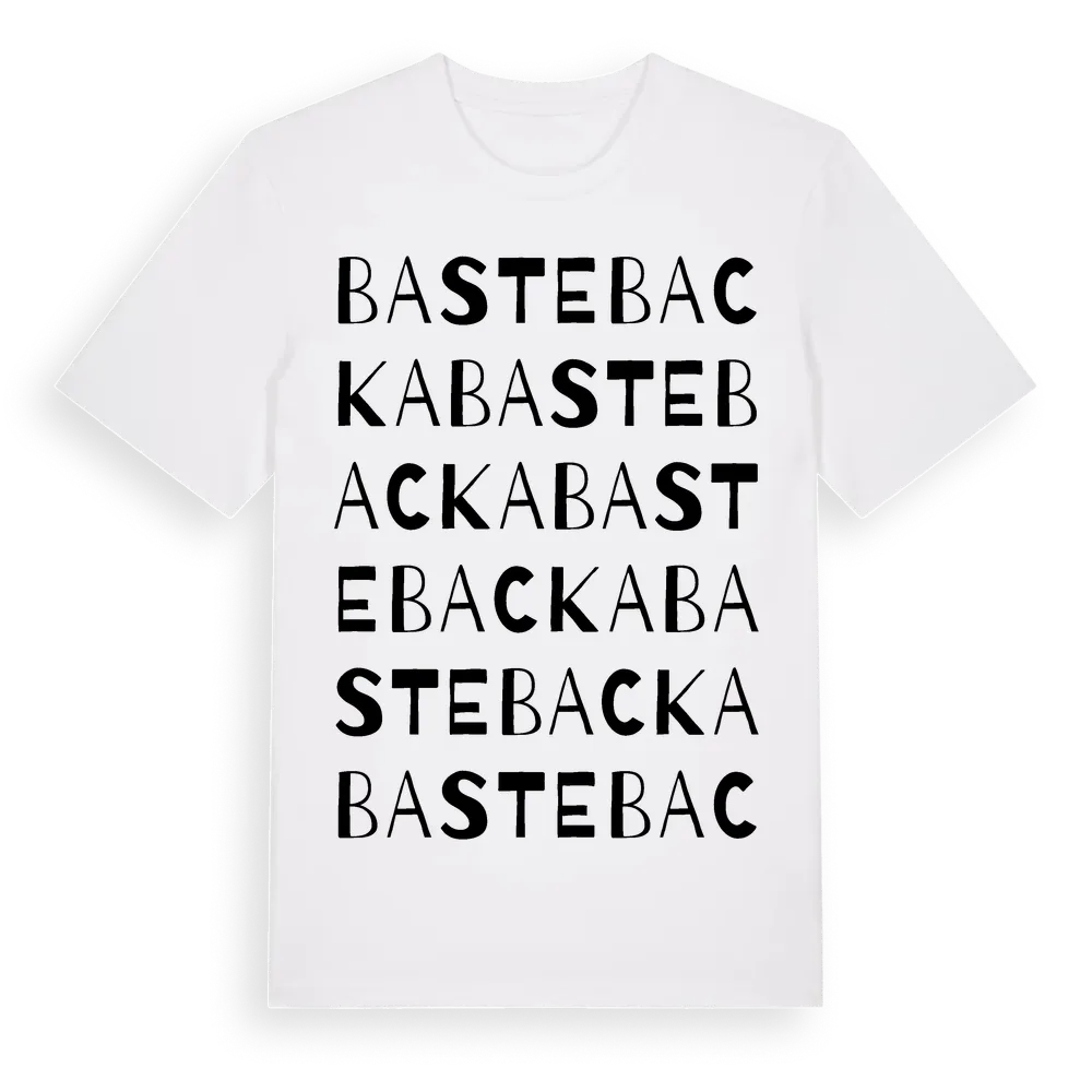 En ordlek byggd på Bastebackas namn. Subtilt och klurig – ett motiv som bara de som verkligen känner platsen fullt ut förstår. Premium bomull, unisex – från Bastebacka i Västra Götalands län.