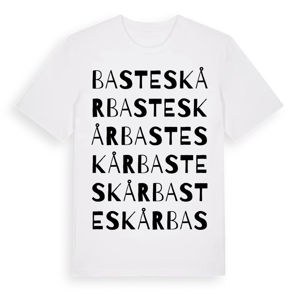 Basteskår ordlek t-shirt är inspirerad av byn Basteskår i Västra Götalands län, Sverige. Tröjan är designad för dig som har en speciell koppling till platsen – oavsett om du bor här, har rötterna här eller bara älskar Basteskår.