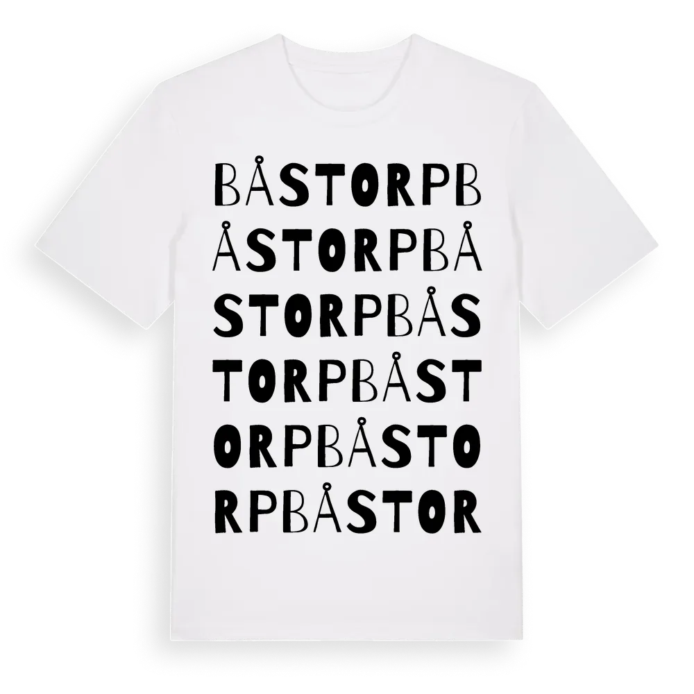 Båstorp ordlek t-shirt är inspirerad av byn Båstorp i Västra Götalands län, Sverige. Tröjan är designad för dig som har en speciell koppling till platsen – oavsett om du bor här, har rötterna här eller bara älskar Båstorp.