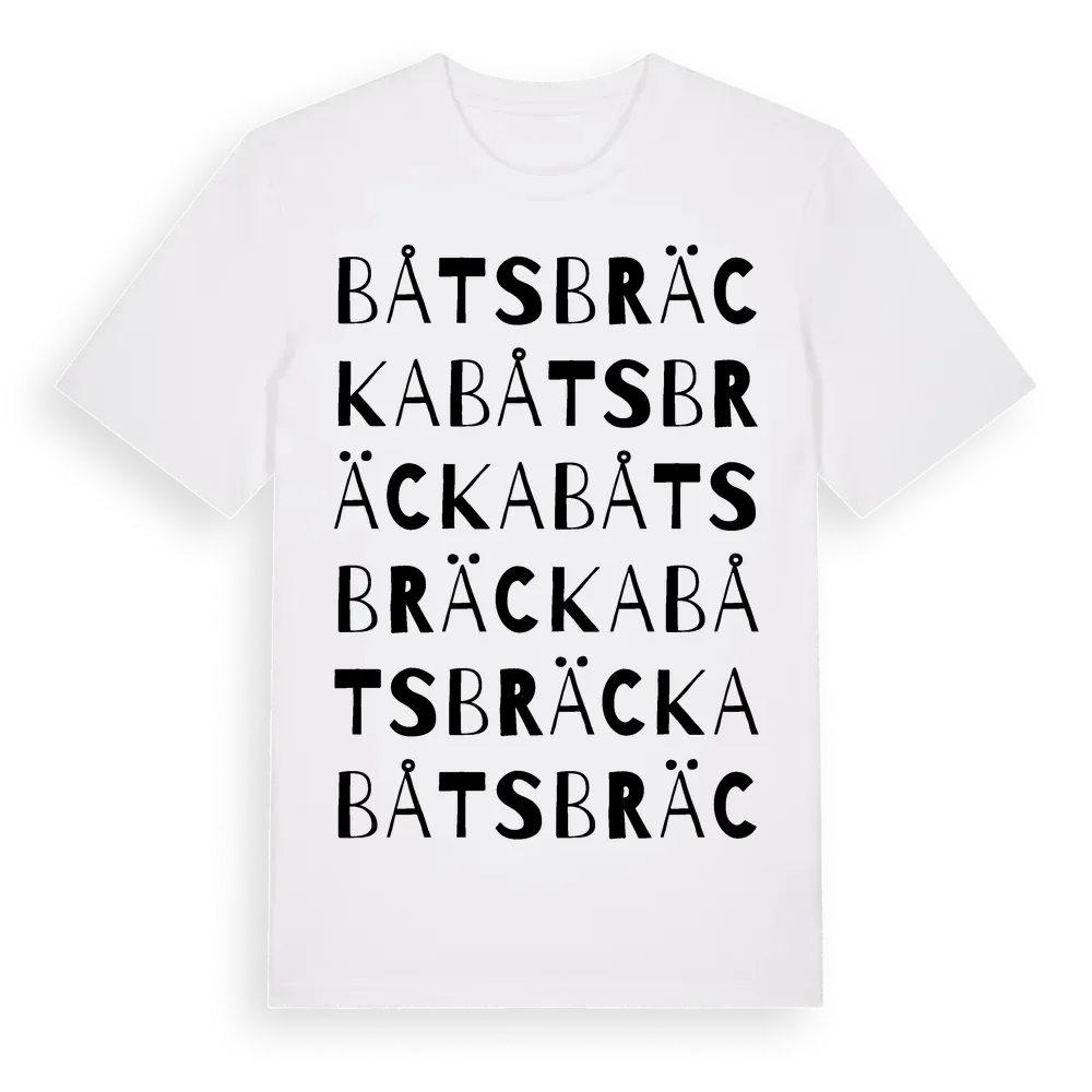 Båtsbräcka ordlek t-shirt är inspirerad av Båtsbräcka i Västra Götalands län, Sverige. Tröjan är designad för dig som har en speciell koppling till platsen – oavsett om du bor här, har rötterna här eller bara älskar Båtsbräcka.