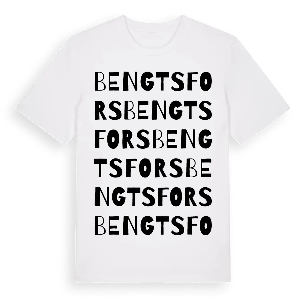 En ordlek byggd på Bengtsforss namn. Subtilt och klurig – ett motiv som bara de som verkligen känner platsen fullt ut förstår. Premium bomull, unisex – från staden Bengtsfors i Västra Götalands län.