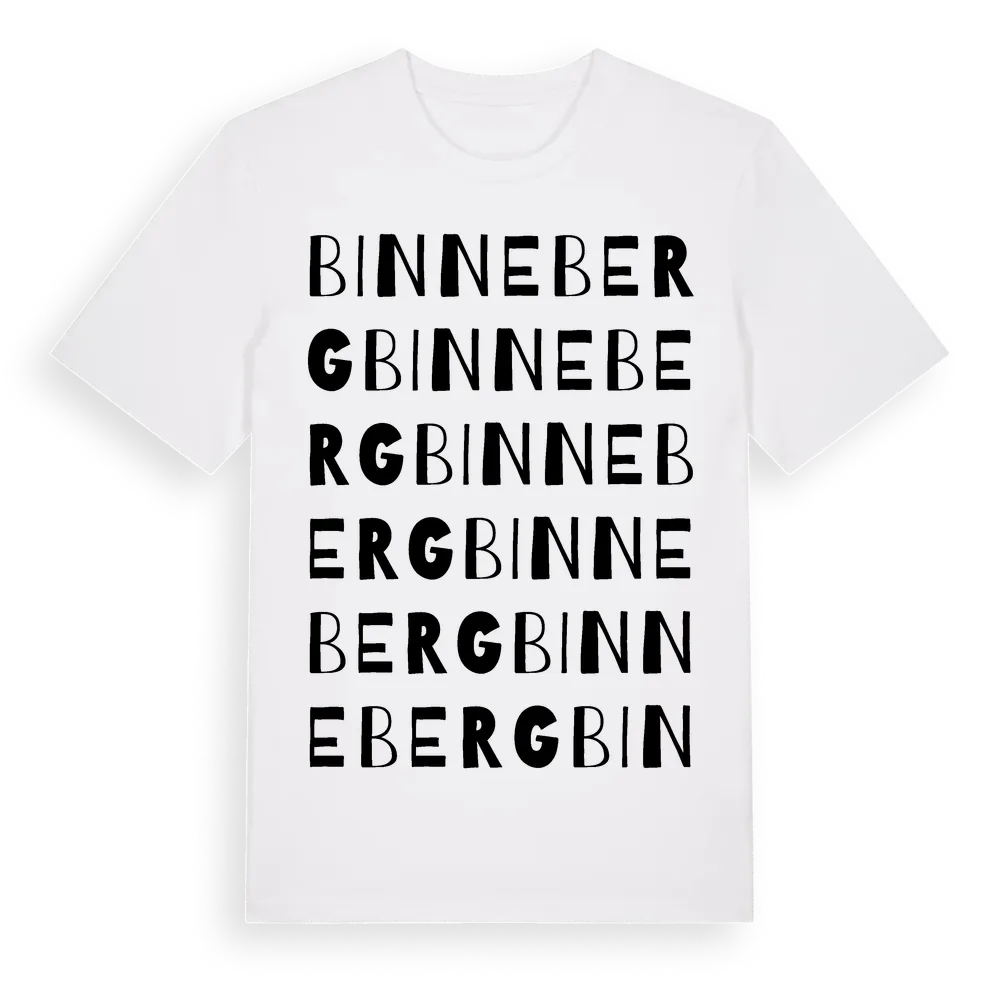 Binneberg ordlek t-shirt är inspirerad av Binneberg i Västra Götalands län, Sverige. Tröjan är designad för dig som har en speciell koppling till platsen – oavsett om du bor här, har rötterna här eller bara älskar Binneberg.