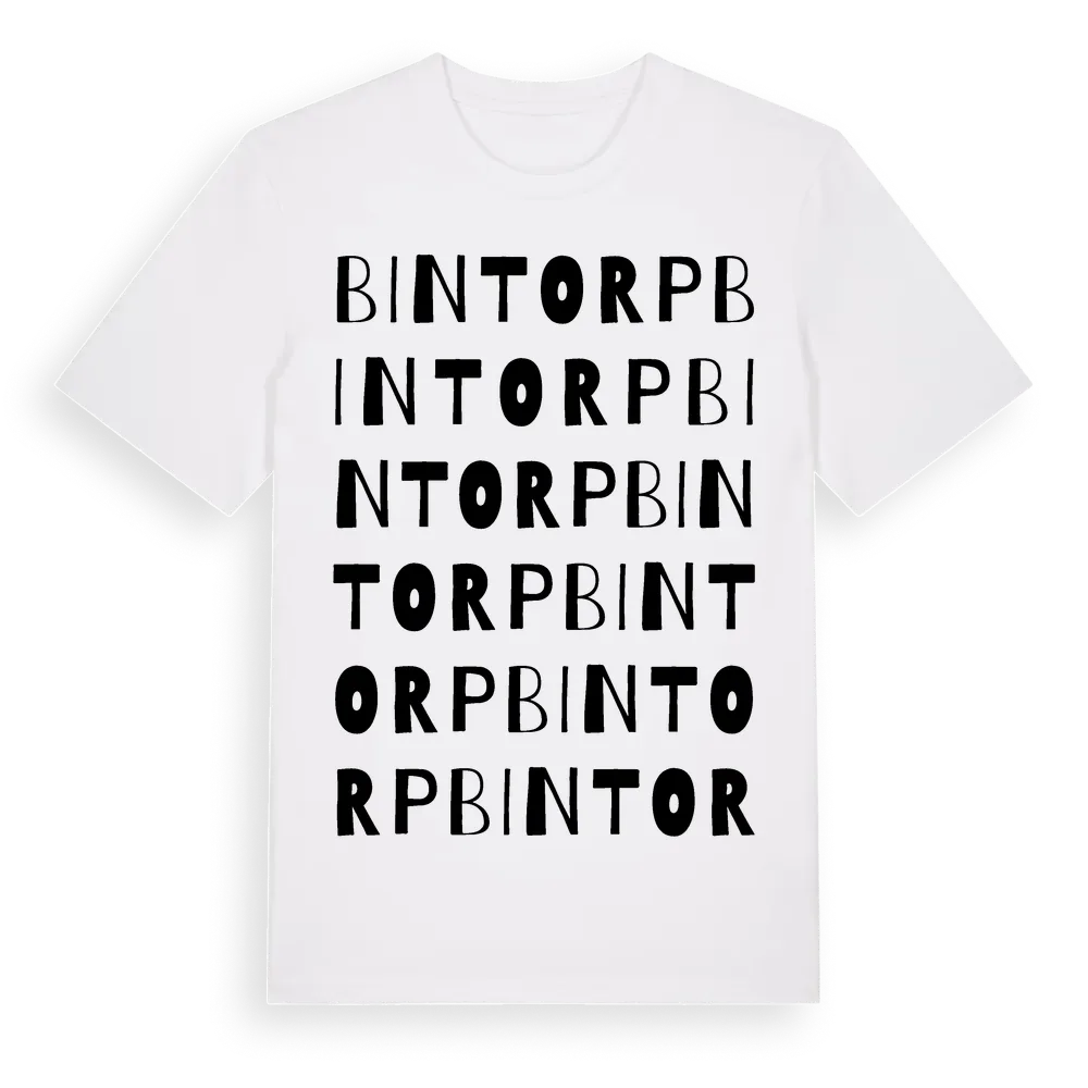 Bintorp ordlek t-shirt är inspirerad av byn Bintorp i Västra Götalands län, Sverige. Tröjan är designad för dig som har en speciell koppling till platsen – oavsett om du bor här, har rötterna här eller bara älskar Bintorp.