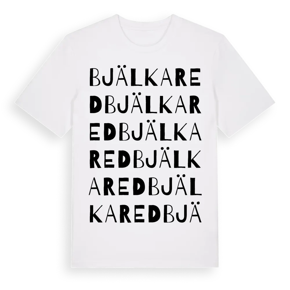 Bjälkared ordlek t-shirt är inspirerad av byn Bjälkared i Västra Götalands län, Sverige. Tröjan är designad för dig som har en speciell koppling till platsen – oavsett om du bor här, har rötterna här eller bara älskar Bjälkared.