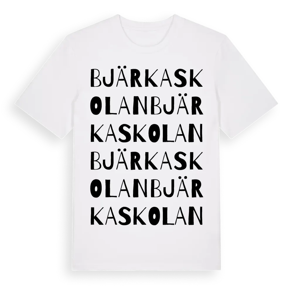Bjärkaskolan ordlek t-shirt är inspirerad av Bjärkaskolan i Västra Götalands län, Sverige. Tröjan är designad för dig som har en speciell koppling till platsen – oavsett om du bor här, har rötterna här eller bara älskar Bjärkaskolan.
