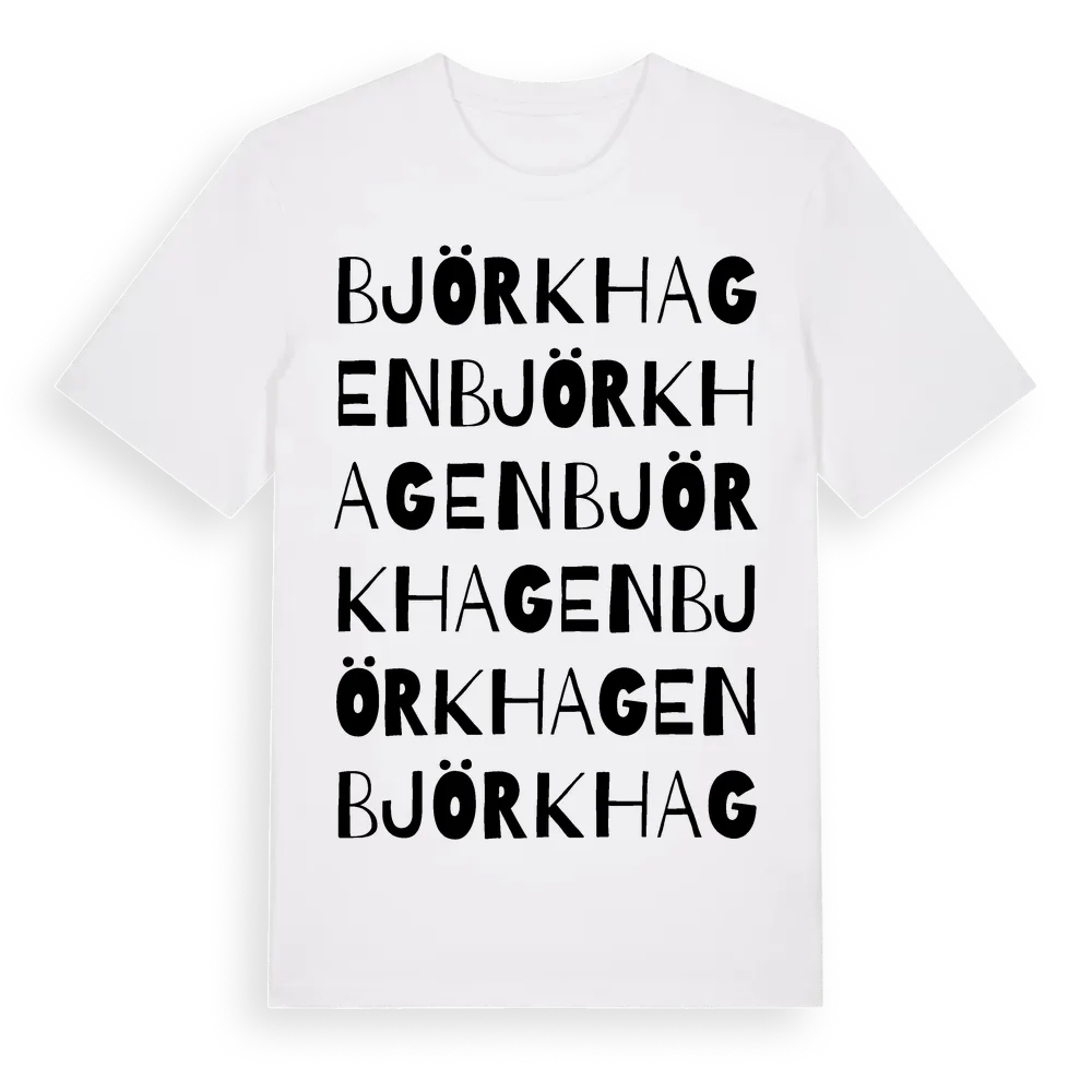 Björkhagen ordlek t-shirt är inspirerad av Björkhagen i Västra Götalands län, Sverige. Tröjan är designad för dig som har en speciell koppling till platsen – oavsett om du bor här, har rötterna här eller bara älskar Björkhagen.