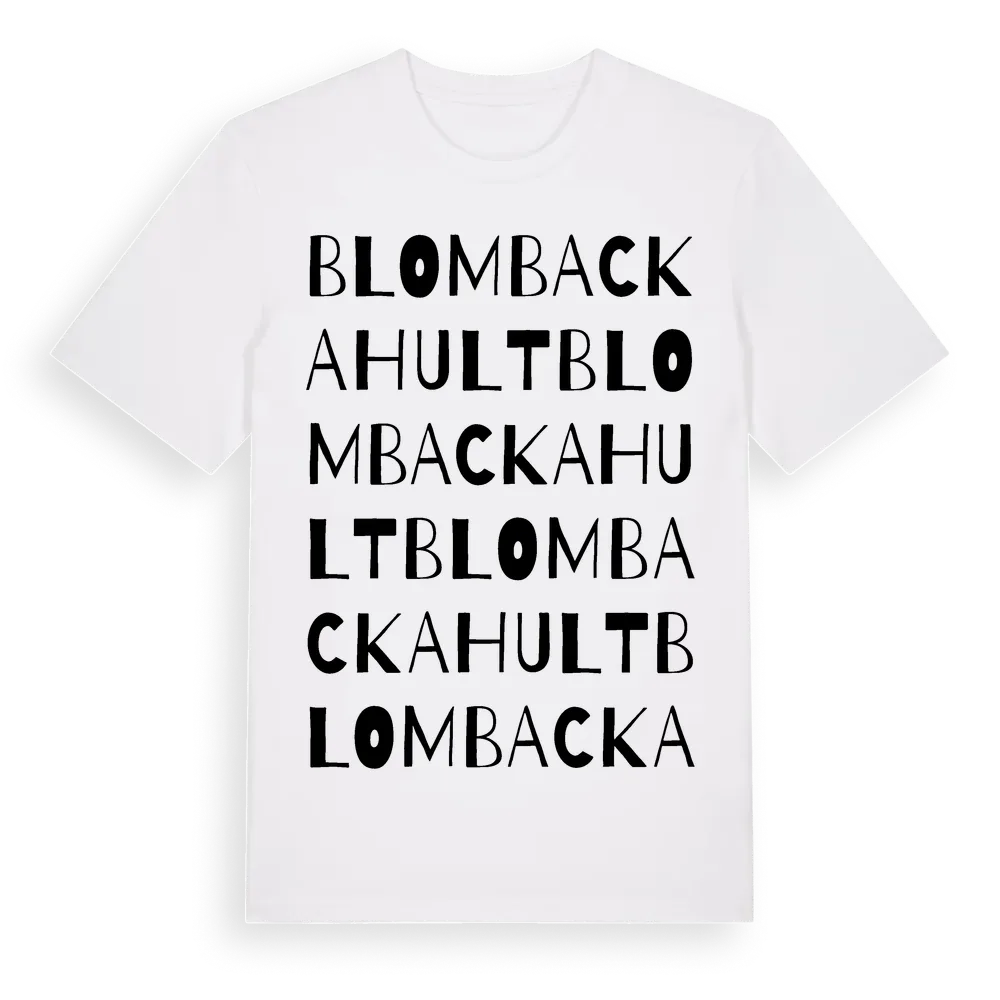 Blombackahult ordlek t-shirt är inspirerad av Blombackahult i Västra Götalands län, Sverige. Tröjan är designad för dig som har en speciell koppling till platsen – oavsett om du bor här, har rötterna här eller bara älskar Blombackahult.