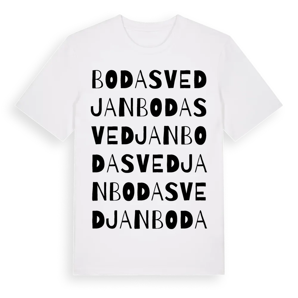 Bodasvedjan ordlek t-shirt är inspirerad av Bodasvedjan i Västra Götalands län, Sverige. Tröjan är designad för dig som har en speciell koppling till platsen – oavsett om du bor här, har rötterna här eller bara älskar Bodasvedjan.
