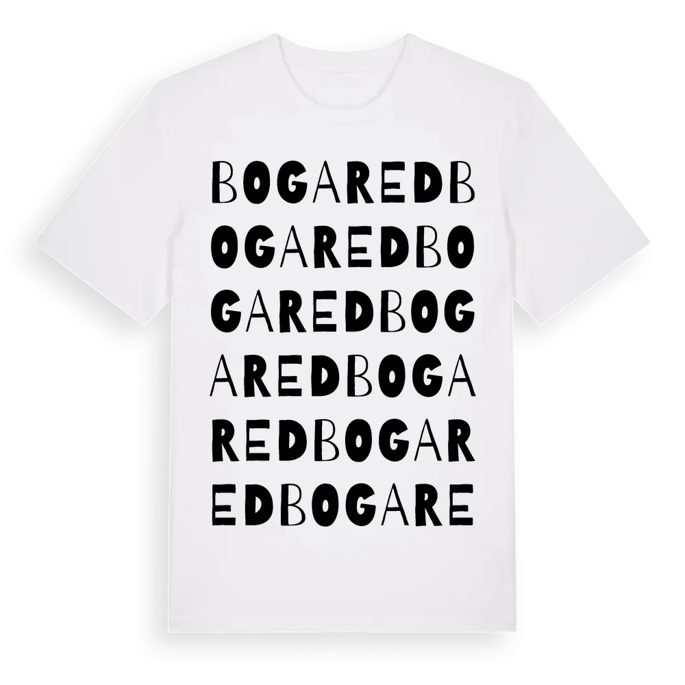 Bogared ordlek t-shirt är inspirerad av byn Bogared i Västra Götalands län, Sverige. Tröjan är designad för dig som har en speciell koppling till platsen – oavsett om du bor här, har rötterna här eller bara älskar Bogared.