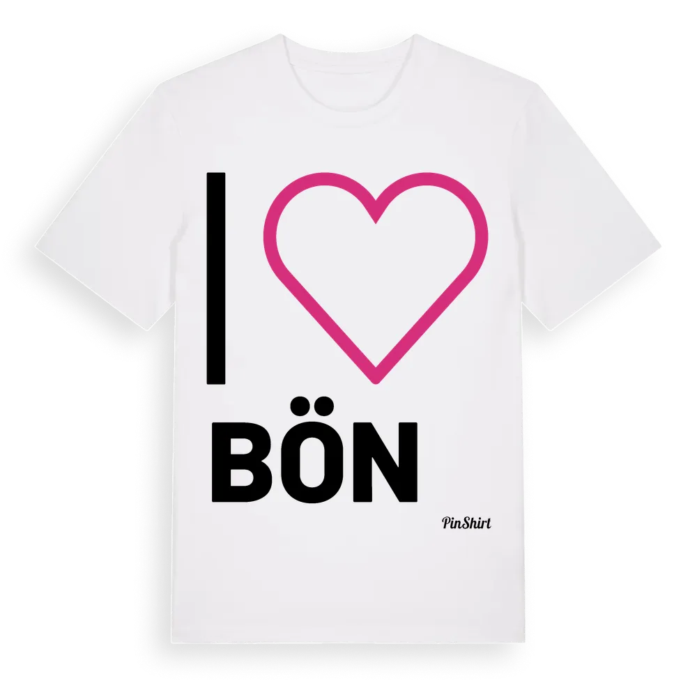 Det klassiska "I ❤ Bön"-motivet i stort format som täcker hela bröstet. För dig som vill visa kärleken till Bön på riktigt. Premium bomull, unisex – från byn Bön i Västra Götalands län.