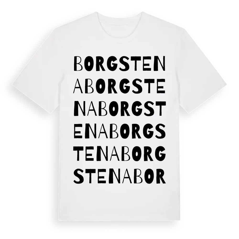 Borgstena ordlek t-shirt är inspirerad av byn Borgstena i Västra Götalands län, Sverige. Tröjan är designad för dig som har en speciell koppling till platsen – oavsett om du bor här, har rötterna här eller bara älskar Borgstena.