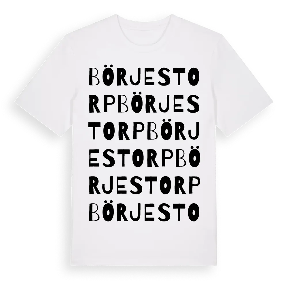 Börjestorp ordlek t-shirt är inspirerad av Börjestorp i Västra Götalands län, Sverige. Tröjan är designad för dig som har en speciell koppling till platsen – oavsett om du bor här, har rötterna här eller bara älskar Börjestorp.