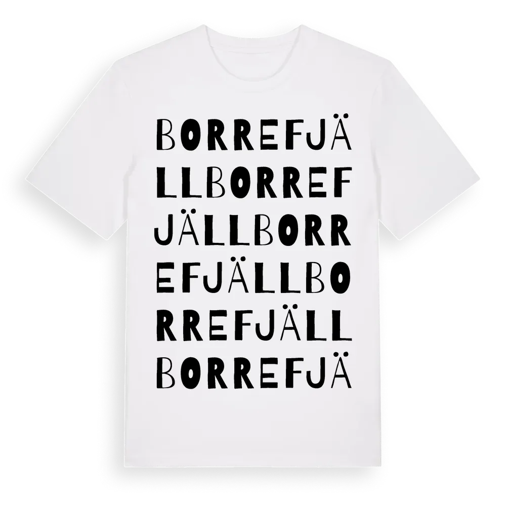 Borrefjäll ordlek t-shirt är inspirerad av Borrefjäll i Västra Götalands län, Sverige. Tröjan är designad för dig som har en speciell koppling till platsen – oavsett om du bor här, har rötterna här eller bara älskar Borrefjäll.