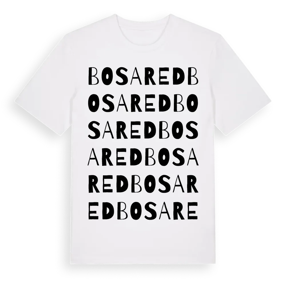 Bosared ordlek t-shirt är inspirerad av byn Bosared i Västra Götalands län, Sverige. Tröjan är designad för dig som har en speciell koppling till platsen – oavsett om du bor här, har rötterna här eller bara älskar Bosared.