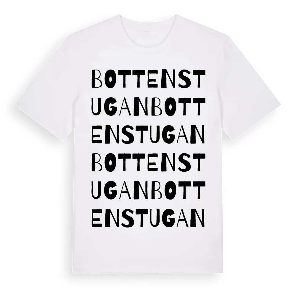 En ordlek byggd på Bottenstugans namn. Subtilt och klurig – ett motiv som bara de som verkligen känner platsen fullt ut förstår. Premium bomull, unisex – från Bottenstugan i Västra Götalands län.