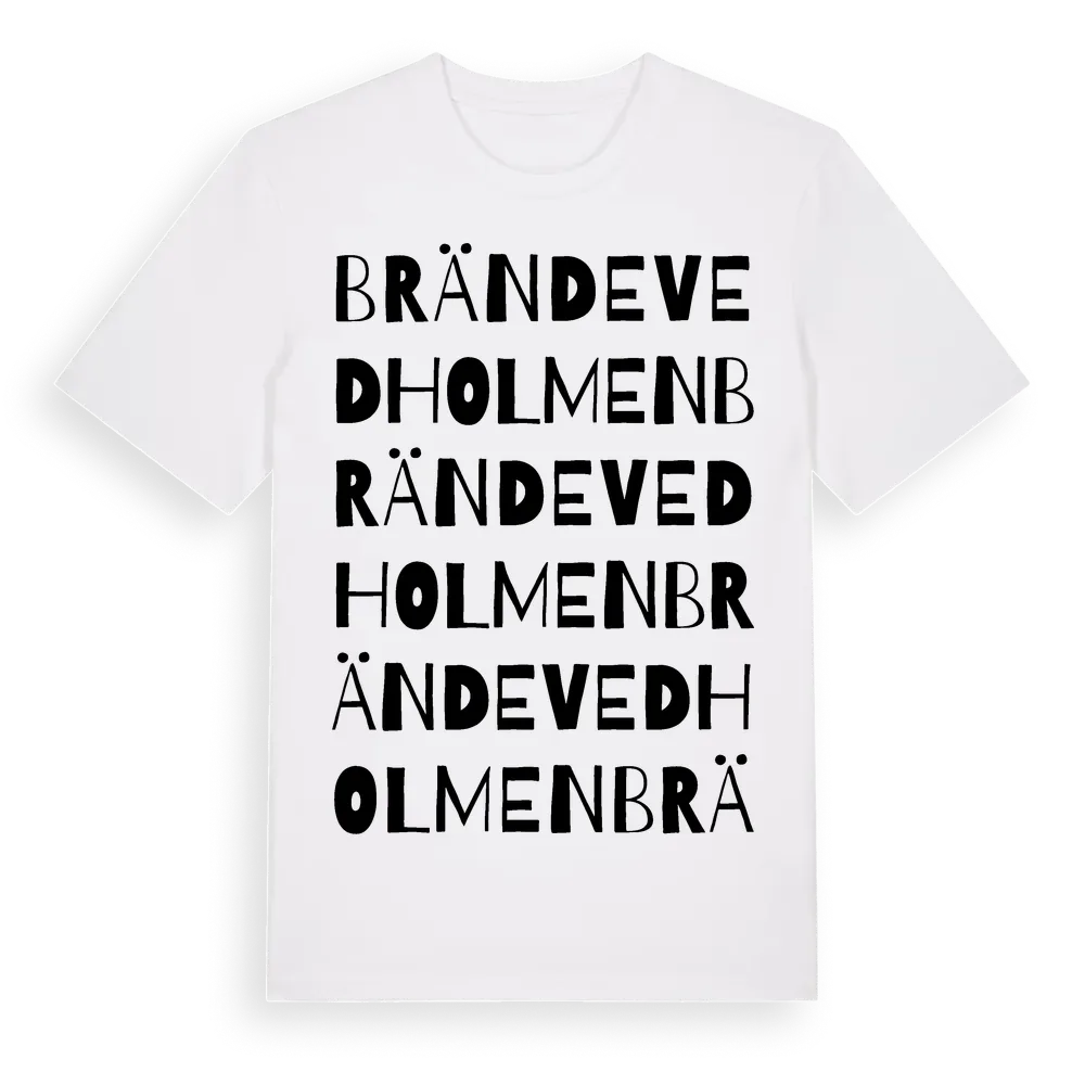 Brände Vedholmen ordlek t-shirt är inspirerad av Brände Vedholmen i Västra Götalands län, Sverige. Tröjan är designad för dig som har en speciell koppling till platsen – oavsett om du bor här, har rötterna här eller bara älskar Brände Vedholmen.