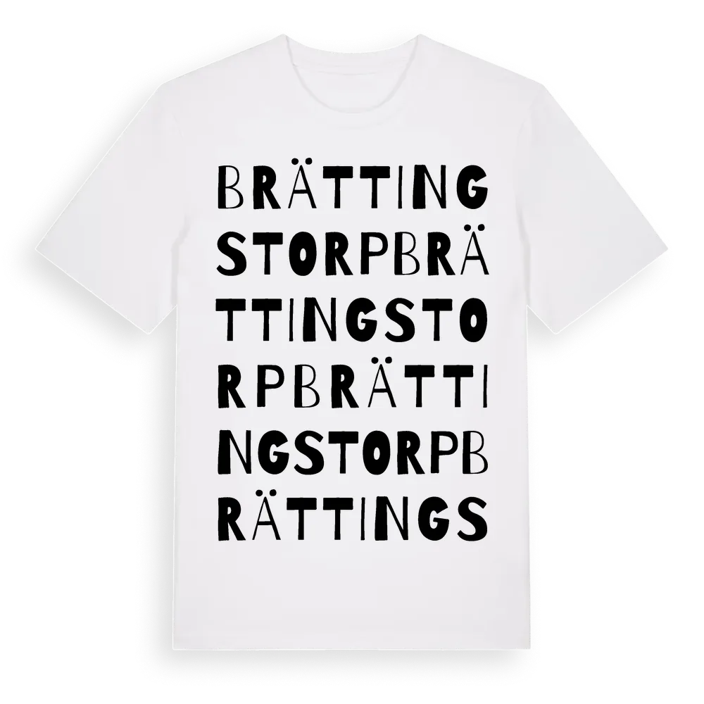 Brättingstorp ordlek t-shirt är inspirerad av byn Brättingstorp i Västra Götalands län, Sverige. Tröjan är designad för dig som har en speciell koppling till platsen – oavsett om du bor här, har rötterna här eller bara älskar Brättingstorp.