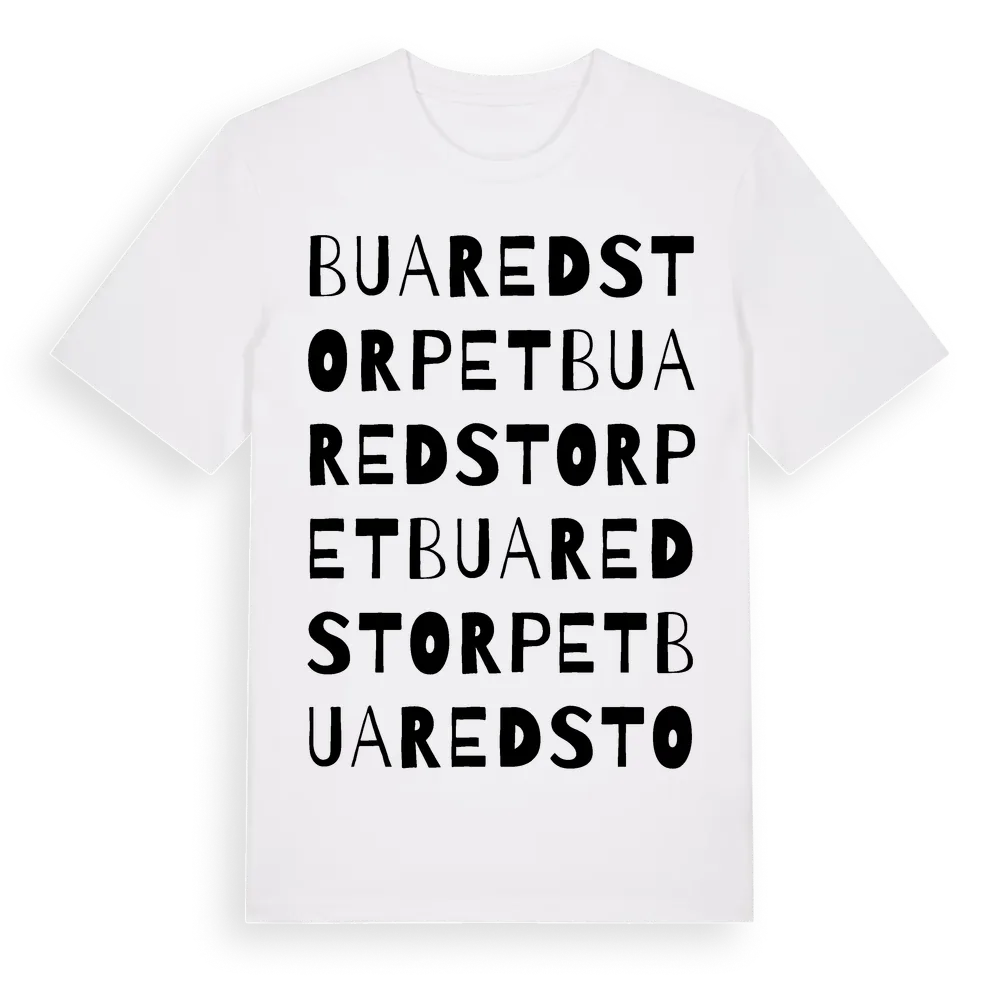 Buaredstorpet ordlek t-shirt är inspirerad av Buaredstorpet i Västra Götalands län, Sverige. Tröjan är designad för dig som har en speciell koppling till platsen – oavsett om du bor här, har rötterna här eller bara älskar Buaredstorpet.