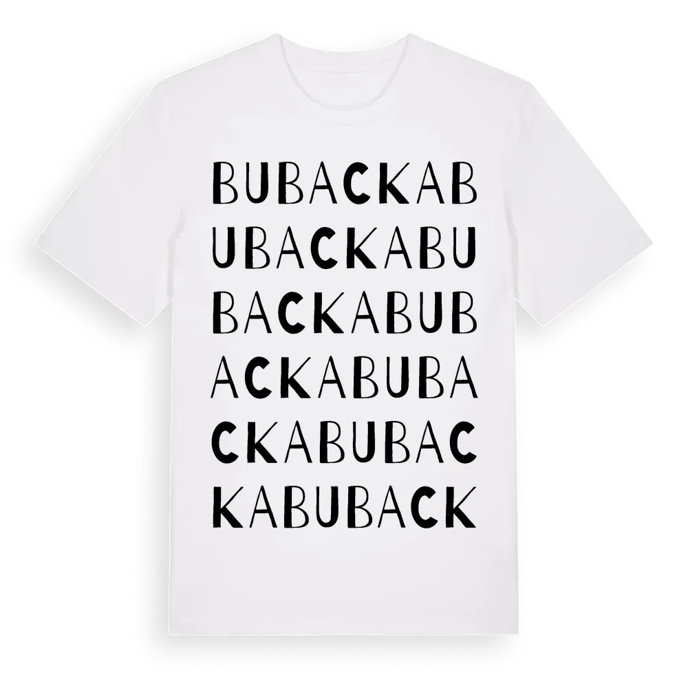 En ordlek byggd på Bubackas namn. Subtilt och klurig – ett motiv som bara de som verkligen känner platsen fullt ut förstår. Premium bomull, unisex – från Bubacka i Västra Götalands län.