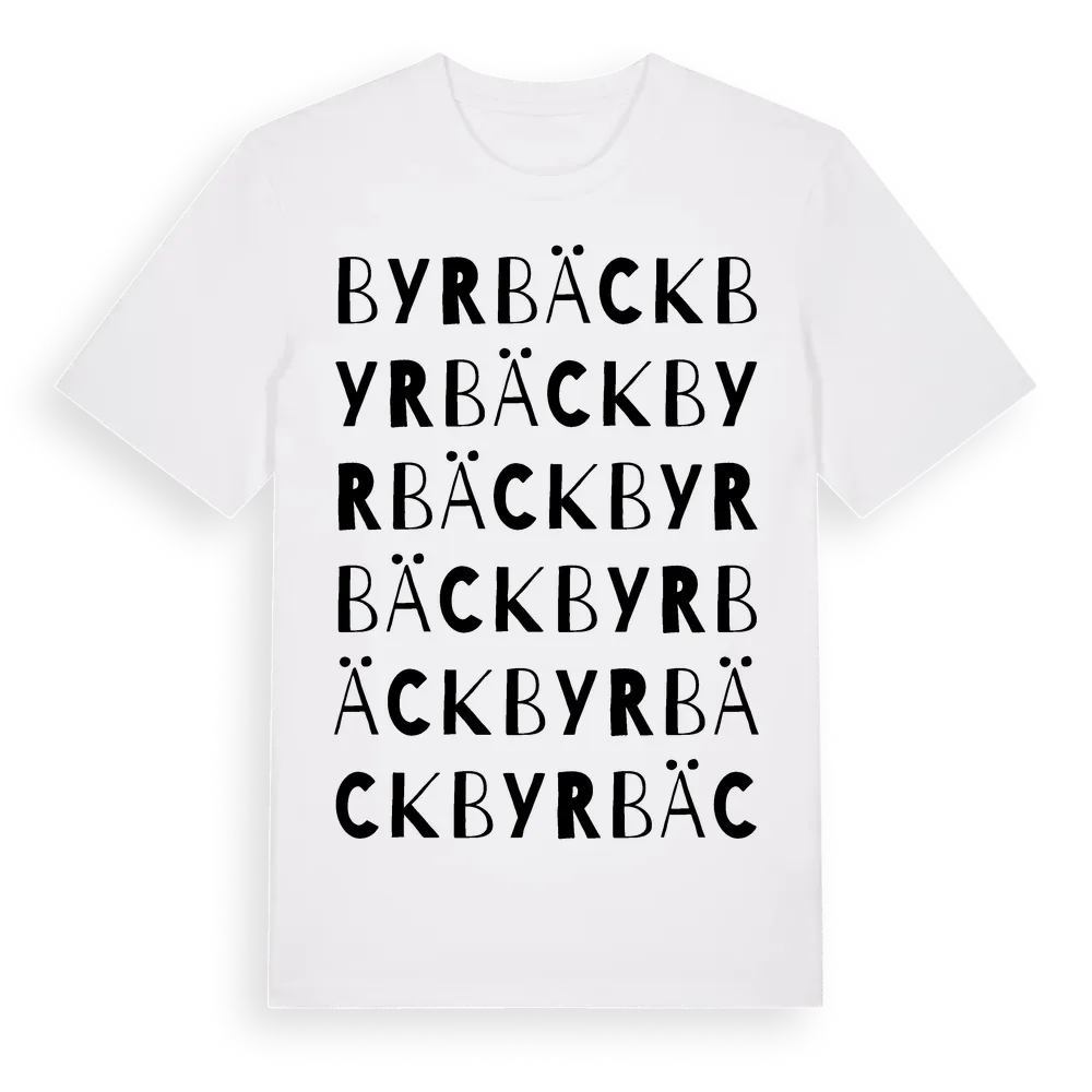 Byrbäck ordlek t-shirt är inspirerad av Byrbäck i Västra Götalands län, Sverige. Tröjan är designad för dig som har en speciell koppling till platsen – oavsett om du bor här, har rötterna här eller bara älskar Byrbäck.