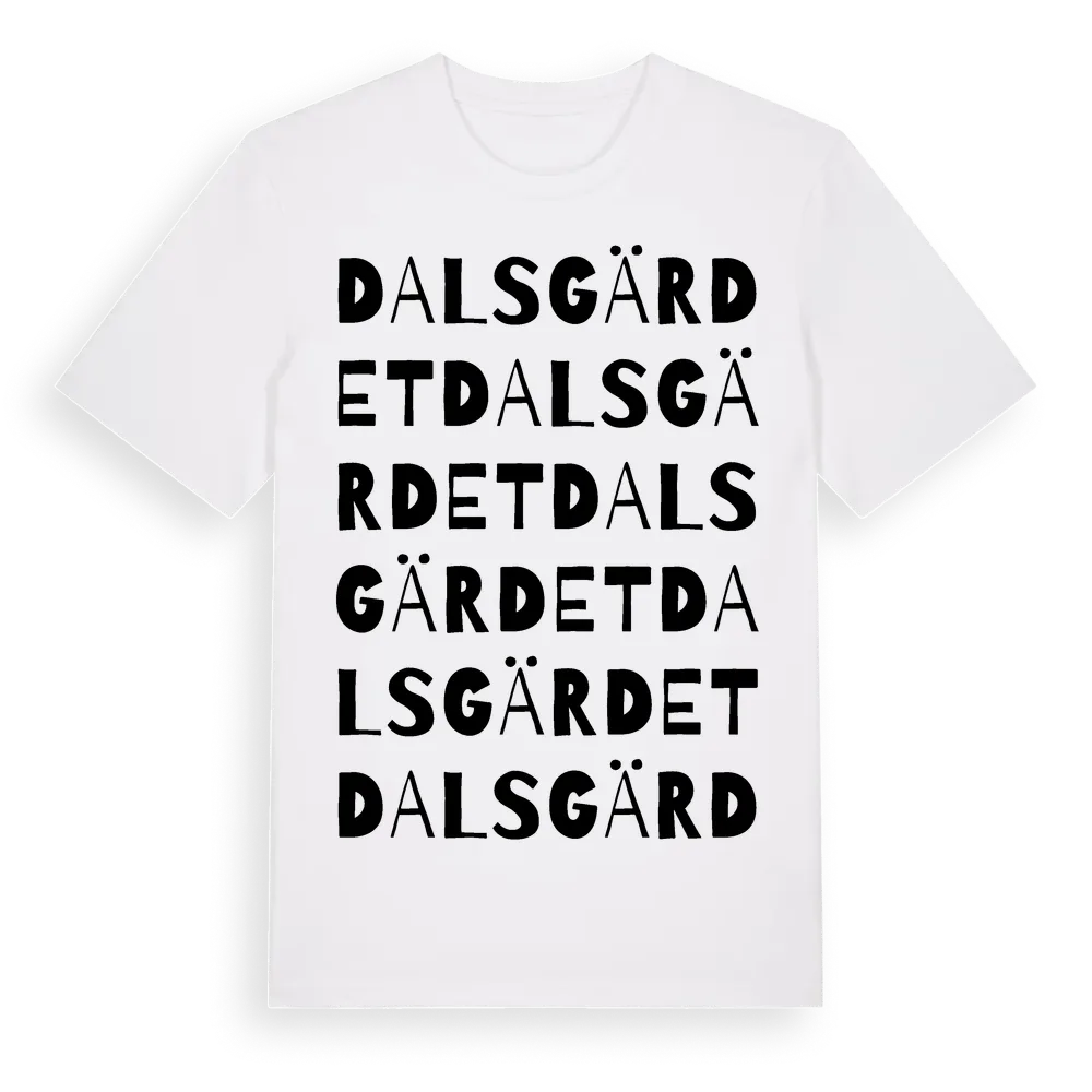 Dalsgärdet ordlek t-shirt är inspirerad av Dalsgärdet i Västra Götalands län, Sverige. Tröjan är designad för dig som har en speciell koppling till platsen – oavsett om du bor här, har rötterna här eller bara älskar Dalsgärdet.