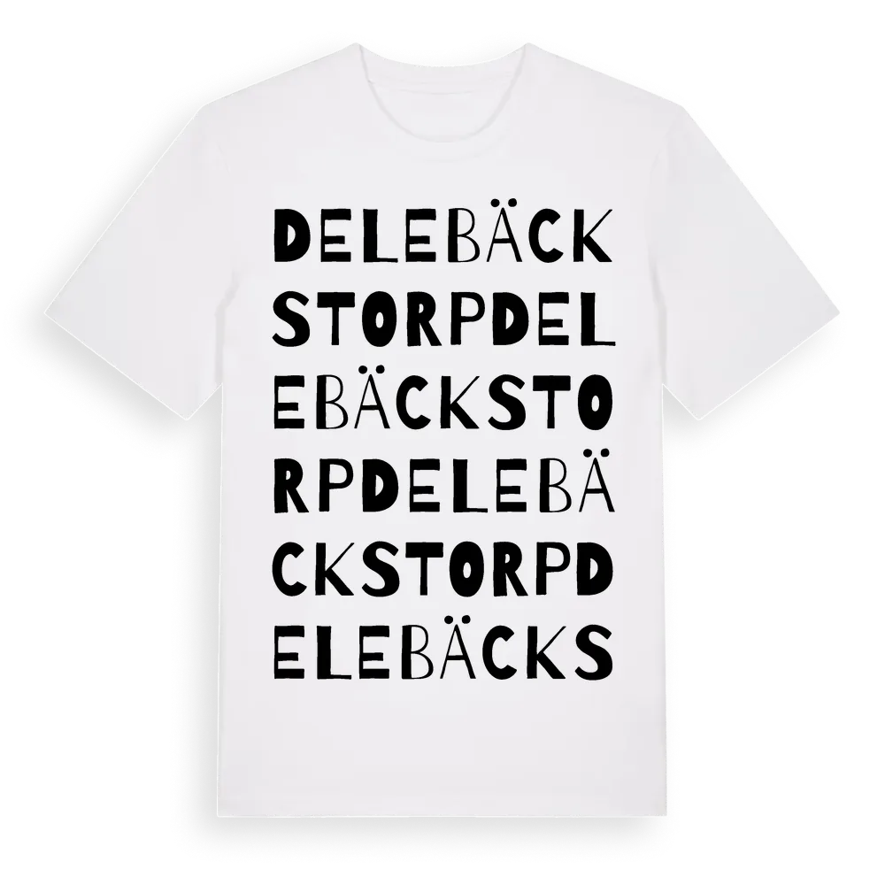 Delebäckstorp ordlek t-shirt är inspirerad av byn Delebäckstorp i Västra Götalands län, Sverige. Tröjan är designad för dig som har en speciell koppling till platsen – oavsett om du bor här, har rötterna här eller bara älskar Delebäckstorp.