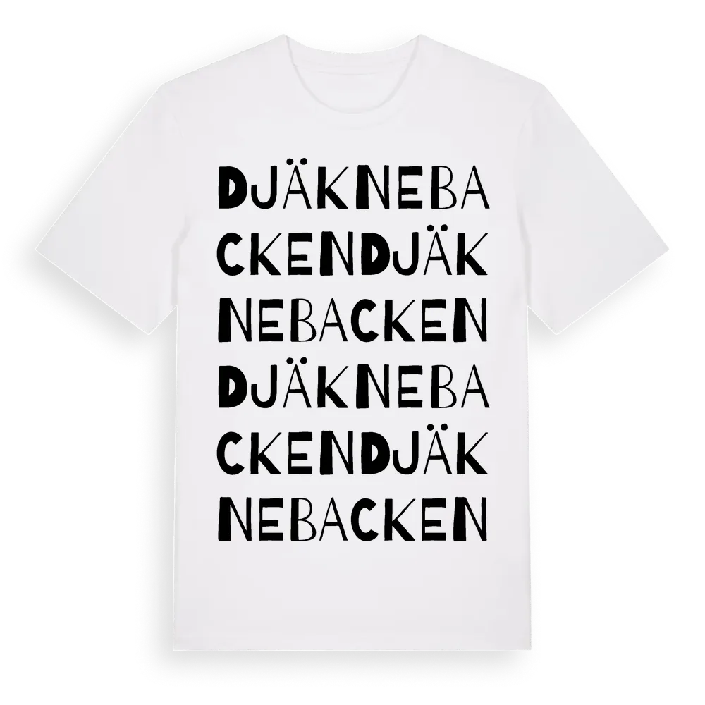 Djäknebacken ordlek t-shirt är inspirerad av Djäknebacken i Västra Götalands län, Sverige. Tröjan är designad för dig som har en speciell koppling till platsen – oavsett om du bor här, har rötterna här eller bara älskar Djäknebacken.