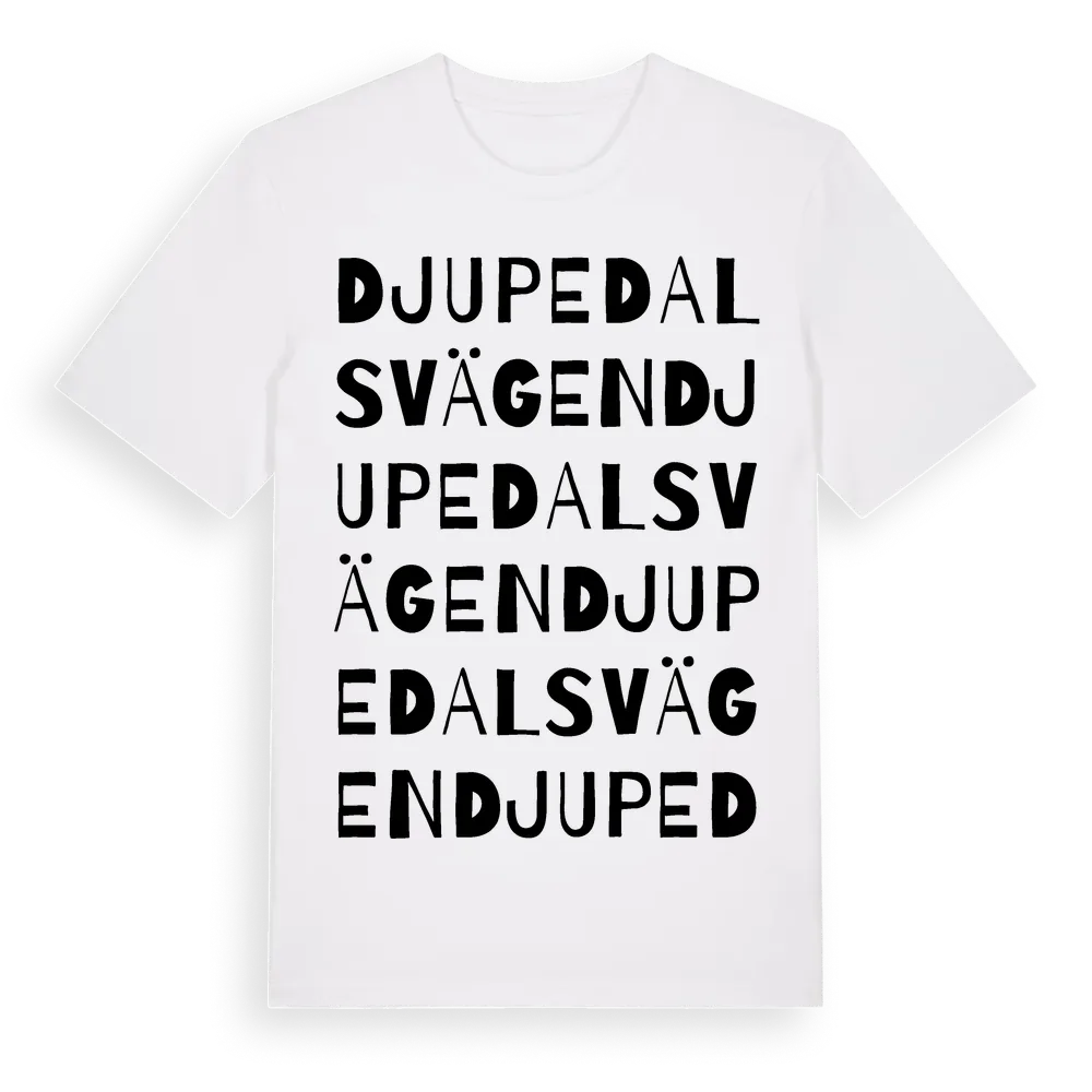Djupedalsvägen ordlek t-shirt är inspirerad av Djupedalsvägen i Västra Götalands län, Sverige. Tröjan är designad för dig som har en speciell koppling till platsen – oavsett om du bor här, har rötterna här eller bara älskar Djupedalsvägen.