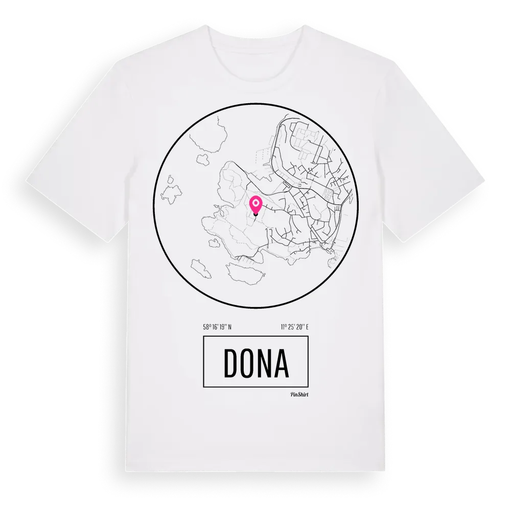 Dona t-shirt är inspirerad av stadsdelen Dona i Västra Götalands län, Sverige. Tröjan är designad för dig som har en speciell koppling till platsen – oavsett om du bor här, har rötterna här eller bara älskar Dona.