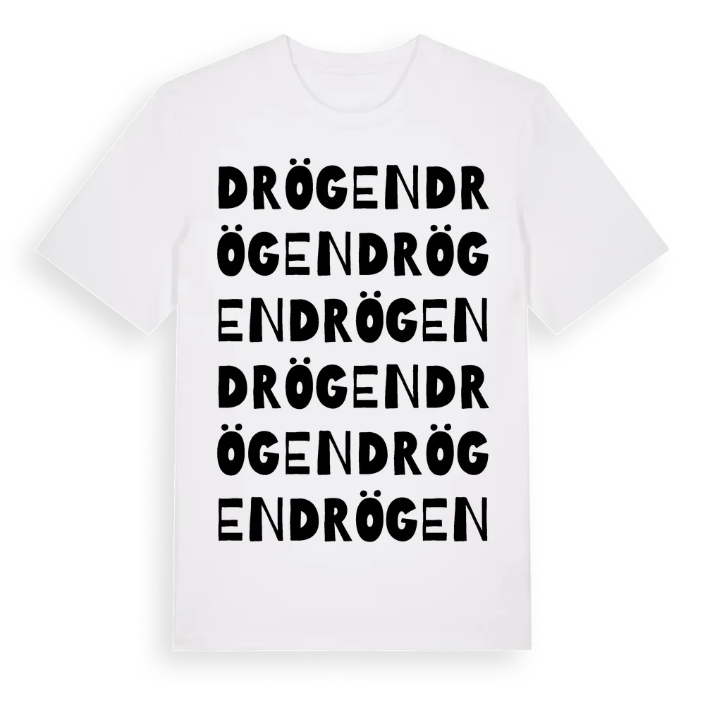 En ordlek byggd på Drögens namn. Subtilt och klurig – ett motiv som bara de som verkligen känner platsen fullt ut förstår. Premium bomull, unisex – från Drögen i Västra Götalands län.