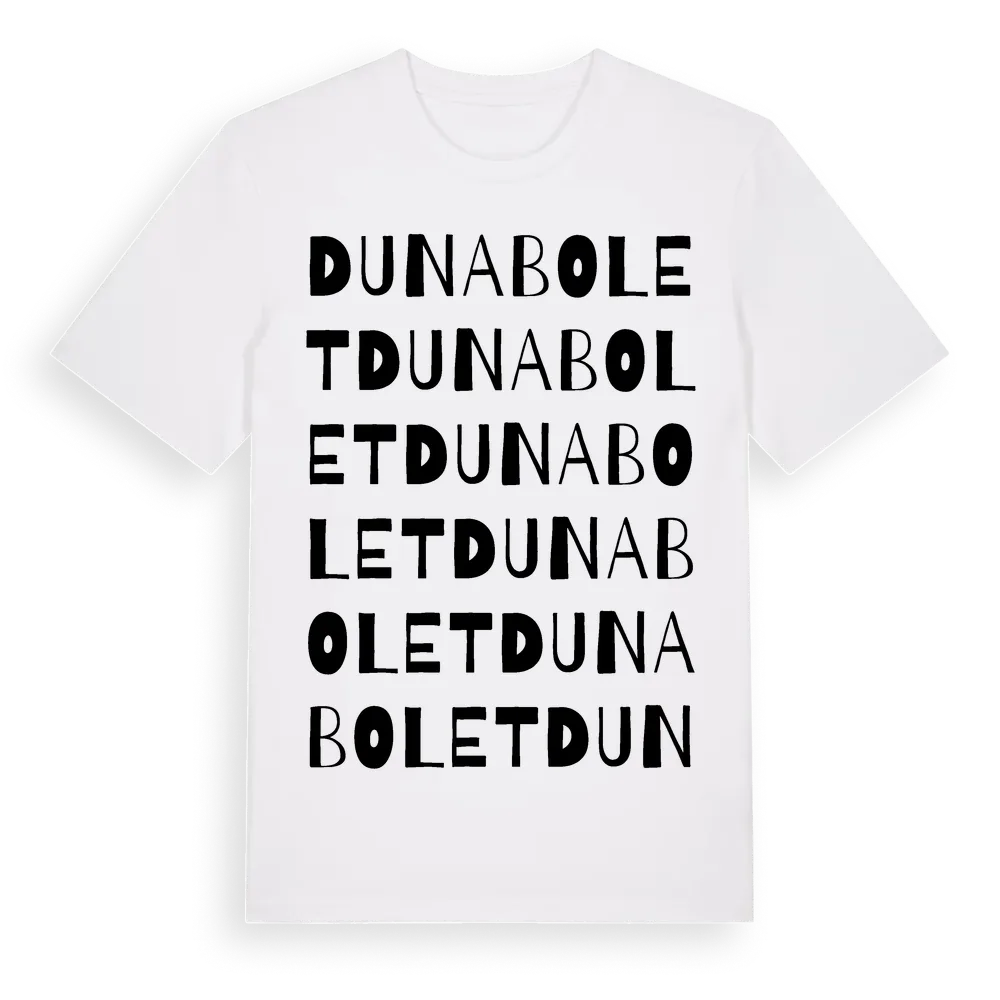 Dunabolet ordlek t-shirt är inspirerad av Dunabolet i Västra Götalands län, Sverige. Tröjan är designad för dig som har en speciell koppling till platsen – oavsett om du bor här, har rötterna här eller bara älskar Dunabolet.