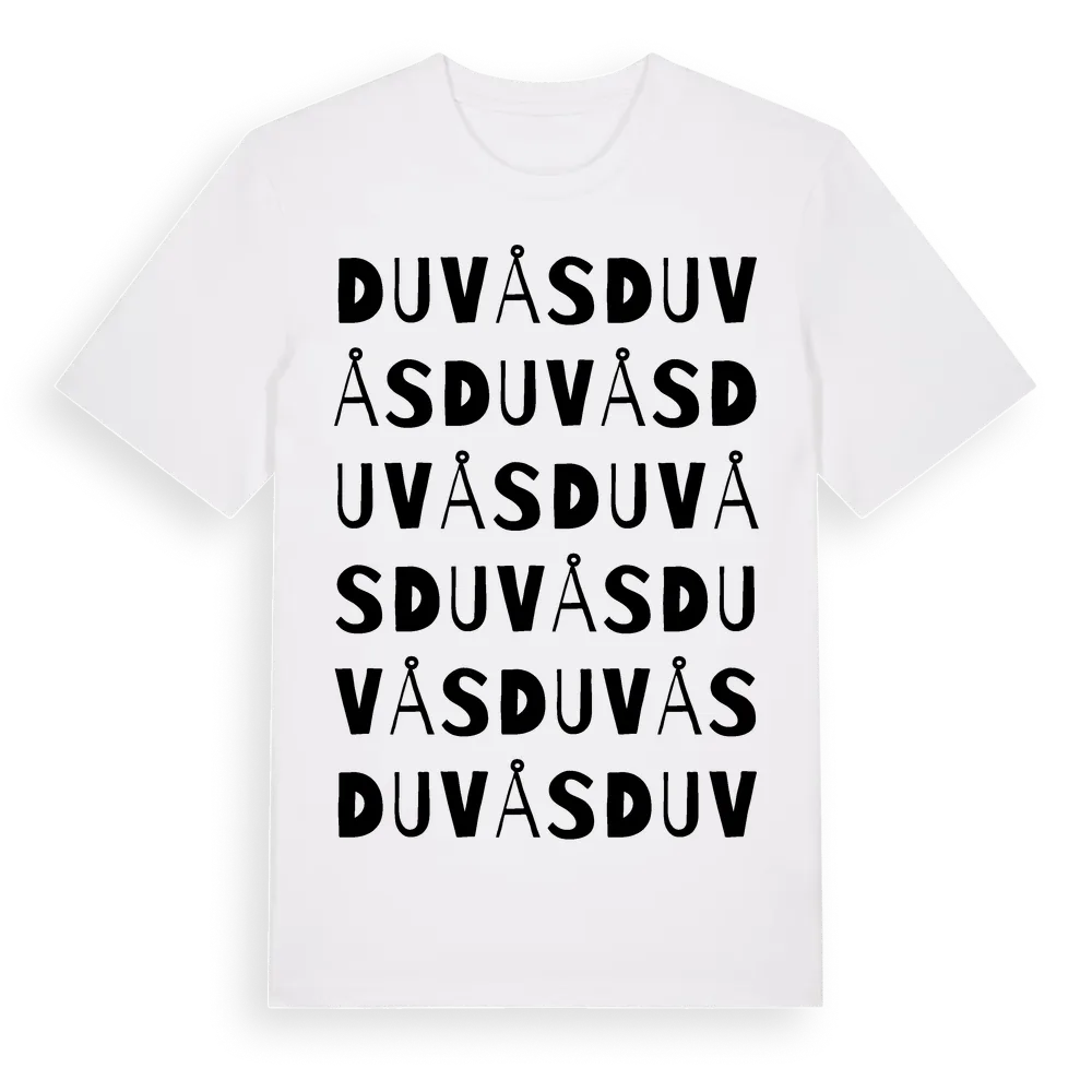 Duvås ordlek t-shirt är inspirerad av byn Duvås i Västra Götalands län, Sverige. Tröjan är designad för dig som har en speciell koppling till platsen – oavsett om du bor här, har rötterna här eller bara älskar Duvås.