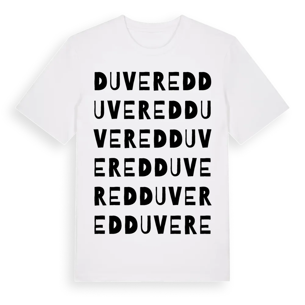 Duvered ordlek t-shirt är inspirerad av byn Duvered i Västra Götalands län, Sverige. Tröjan är designad för dig som har en speciell koppling till platsen – oavsett om du bor här, har rötterna här eller bara älskar Duvered.