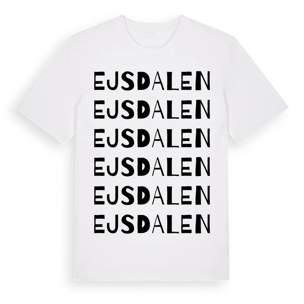 En ordlek byggd på Ejsdalens namn. Subtilt och klurig – ett motiv som bara de som verkligen känner platsen fullt ut förstår. Premium bomull, unisex – från Ejsdalen i Västra Götalands län.