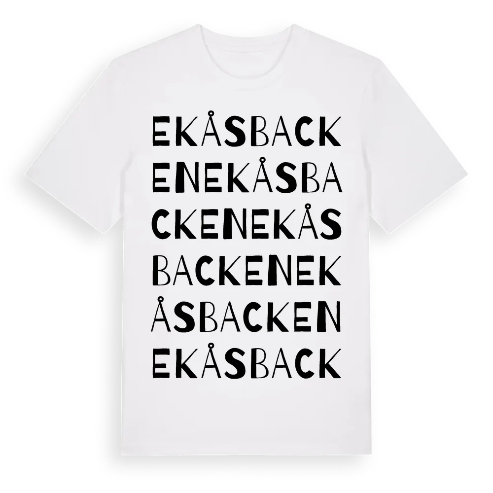 Ekåsbacken ordlek t-shirt är inspirerad av Ekåsbacken i Västra Götalands län, Sverige. Tröjan är designad för dig som har en speciell koppling till platsen – oavsett om du bor här, har rötterna här eller bara älskar Ekåsbacken.