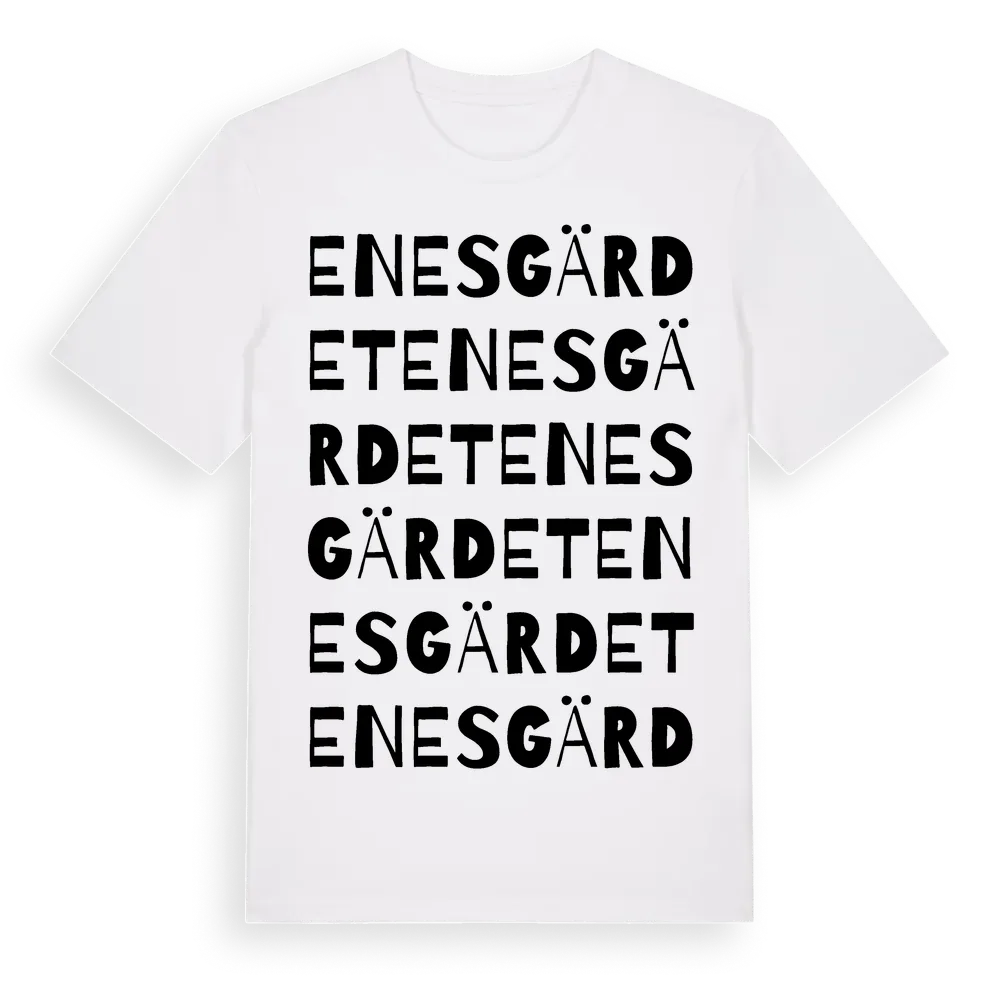 Enesgärdet ordlek t-shirt är inspirerad av Enesgärdet i Västra Götalands län, Sverige. Tröjan är designad för dig som har en speciell koppling till platsen – oavsett om du bor här, har rötterna här eller bara älskar Enesgärdet.