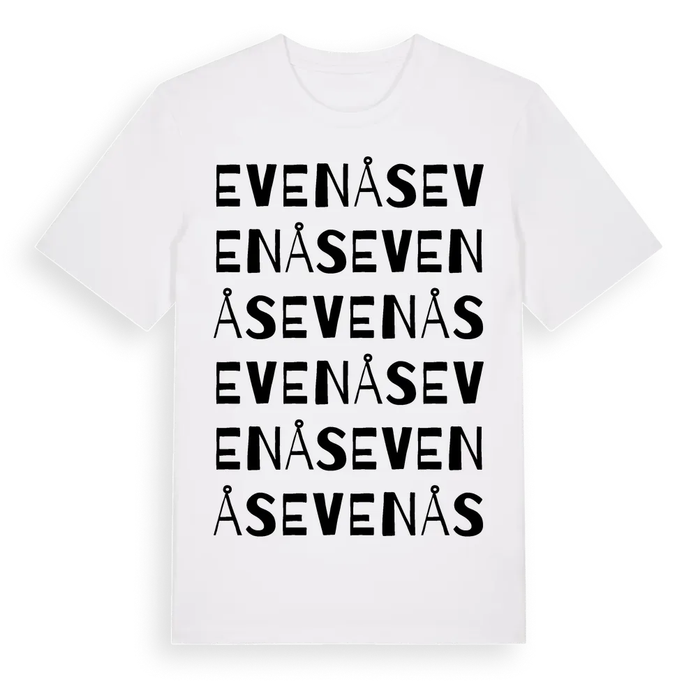 Evenås ordlek t-shirt är inspirerad av Evenås i Västra Götalands län, Sverige. Tröjan är designad för dig som har en speciell koppling till platsen – oavsett om du bor här, har rötterna här eller bara älskar Evenås.