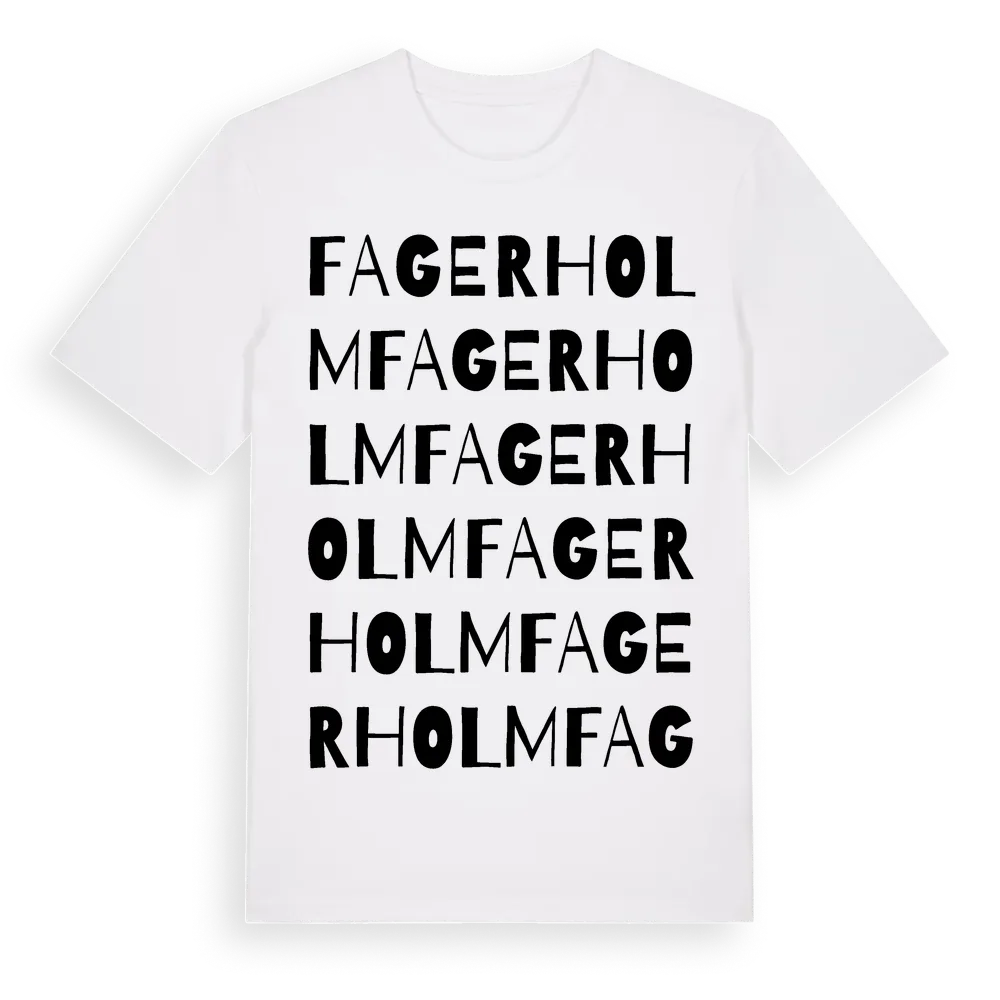 Fagerholm ordlek t-shirt är inspirerad av Fagerholm i Västra Götalands län, Sverige. Tröjan är designad för dig som har en speciell koppling till platsen – oavsett om du bor här, har rötterna här eller bara älskar Fagerholm.