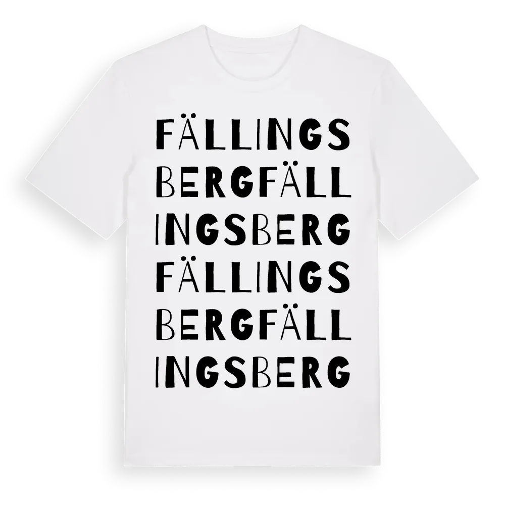 Fällingsberg ordlek t-shirt är inspirerad av Fällingsberg i Västra Götalands län, Sverige. Tröjan är designad för dig som har en speciell koppling till platsen – oavsett om du bor här, har rötterna här eller bara älskar Fällingsberg.
