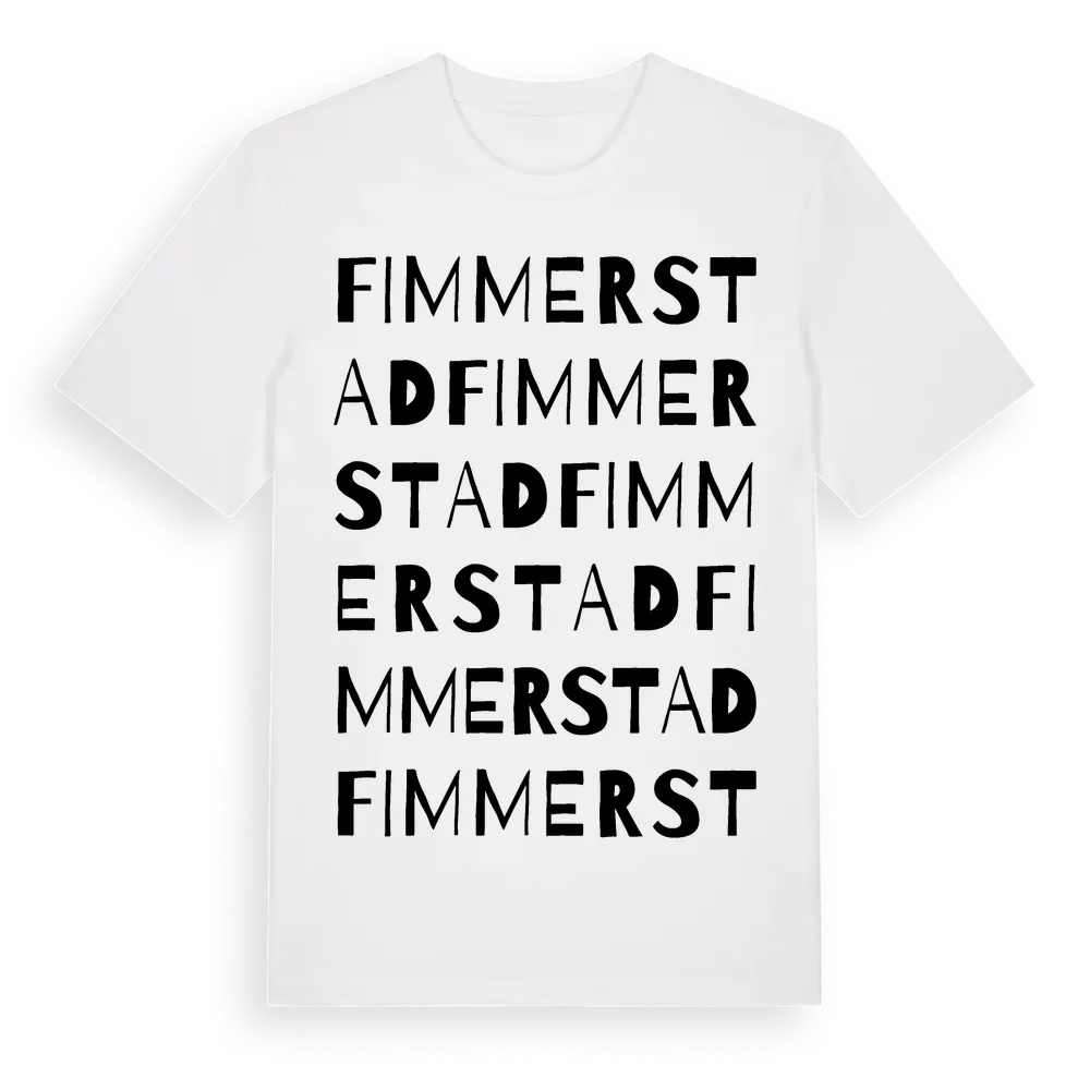 Fimmerstad ordlek t-shirt är inspirerad av byn Fimmerstad i Västra Götalands län, Sverige. Tröjan är designad för dig som har en speciell koppling till platsen – oavsett om du bor här, har rötterna här eller bara älskar Fimmerstad.