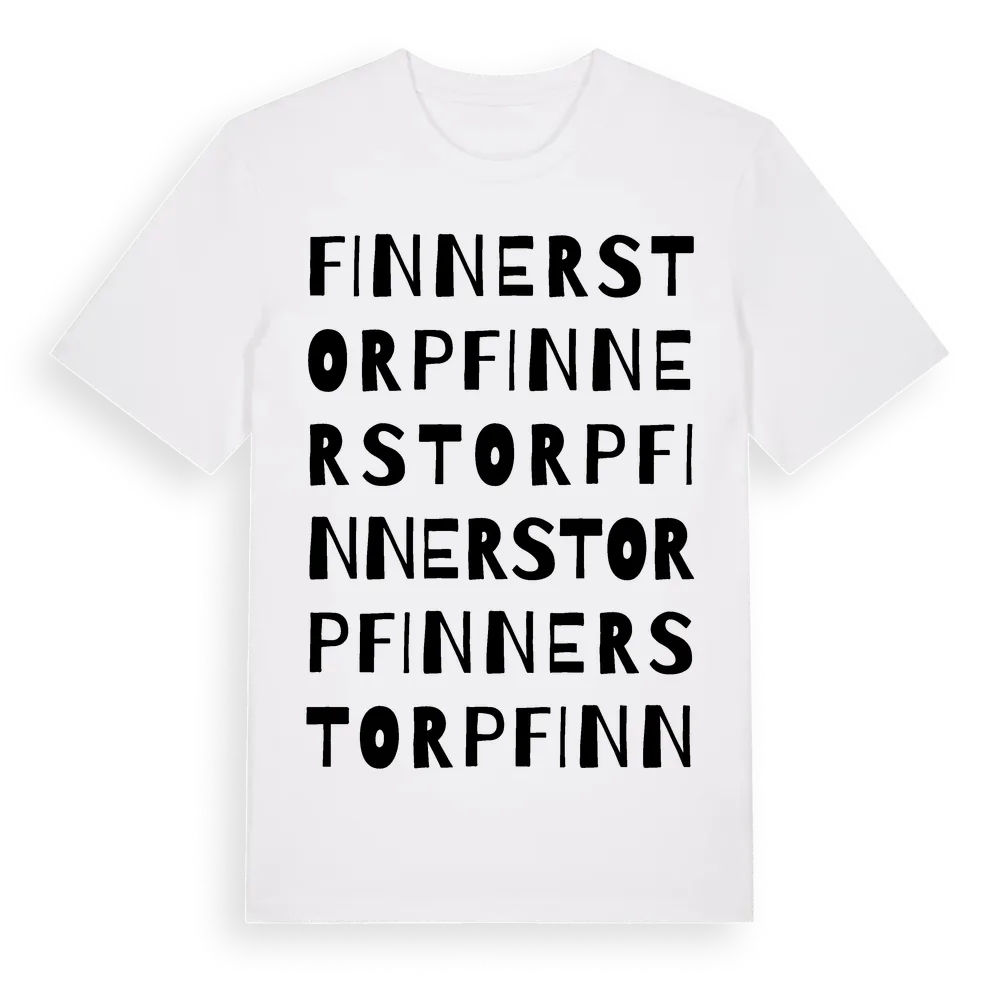 Finnerstorp ordlek t-shirt är inspirerad av Finnerstorp i Västra Götalands län, Sverige. Tröjan är designad för dig som har en speciell koppling till platsen – oavsett om du bor här, har rötterna här eller bara älskar Finnerstorp.