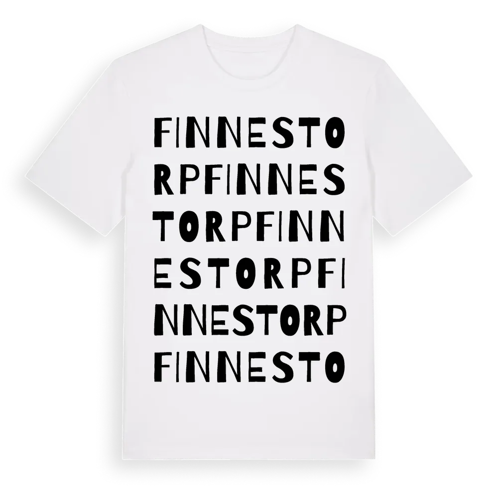 Finnestorp ordlek t-shirt är inspirerad av byn Finnestorp i Västra Götalands län, Sverige. Tröjan är designad för dig som har en speciell koppling till platsen – oavsett om du bor här, har rötterna här eller bara älskar Finnestorp.