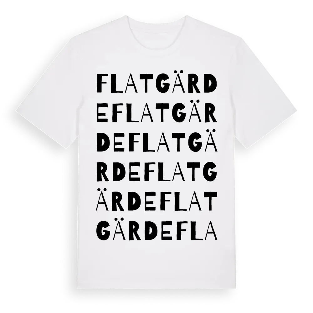 Flatgärde ordlek t-shirt är inspirerad av Flatgärde i Västra Götalands län, Sverige. Tröjan är designad för dig som har en speciell koppling till platsen – oavsett om du bor här, har rötterna här eller bara älskar Flatgärde.