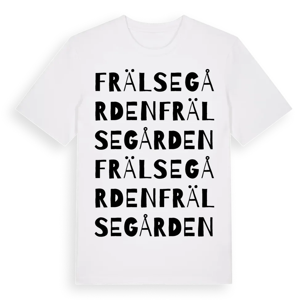 Frälsegården ordlek t-shirt är inspirerad av byn Frälsegården i Västra Götalands län, Sverige. Tröjan är designad för dig som har en speciell koppling till platsen – oavsett om du bor här, har rötterna här eller bara älskar Frälsegården.