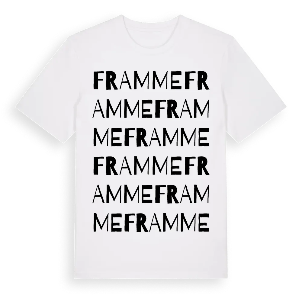 Framme ordlek t-shirt är inspirerad av Framme i Västra Götalands län, Sverige. Tröjan är designad för dig som har en speciell koppling till platsen – oavsett om du bor här, har rötterna här eller bara älskar Framme.