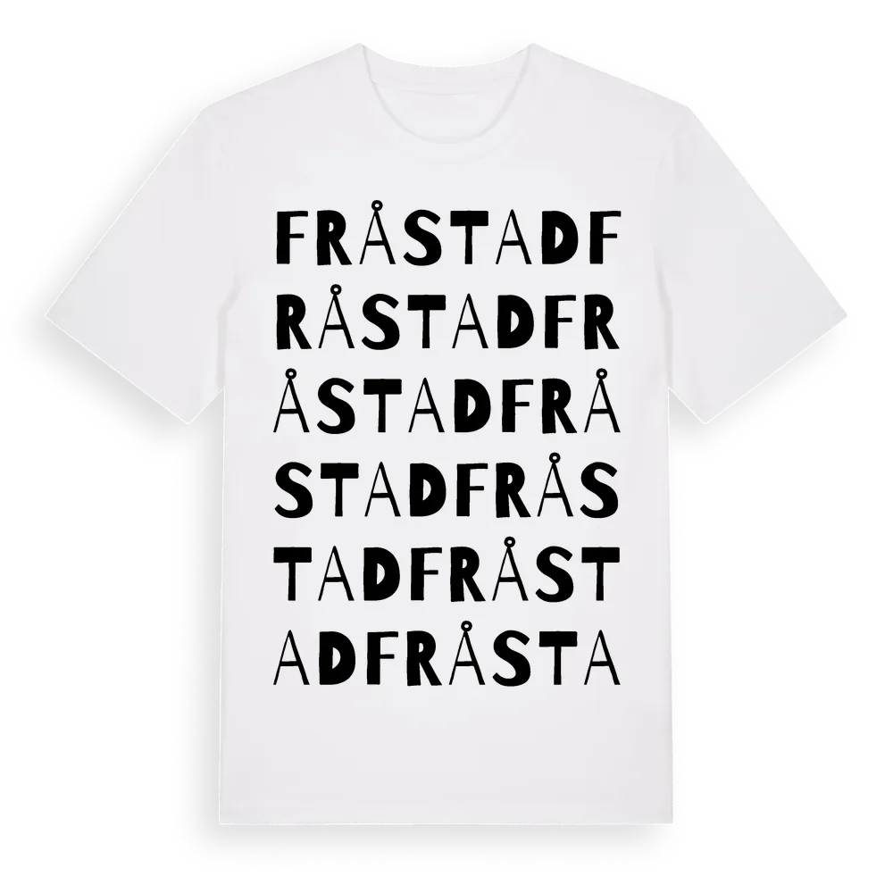 Fråstad ordlek t-shirt är inspirerad av byn Fråstad i Västra Götalands län, Sverige. Tröjan är designad för dig som har en speciell koppling till platsen – oavsett om du bor här, har rötterna här eller bara älskar Fråstad.