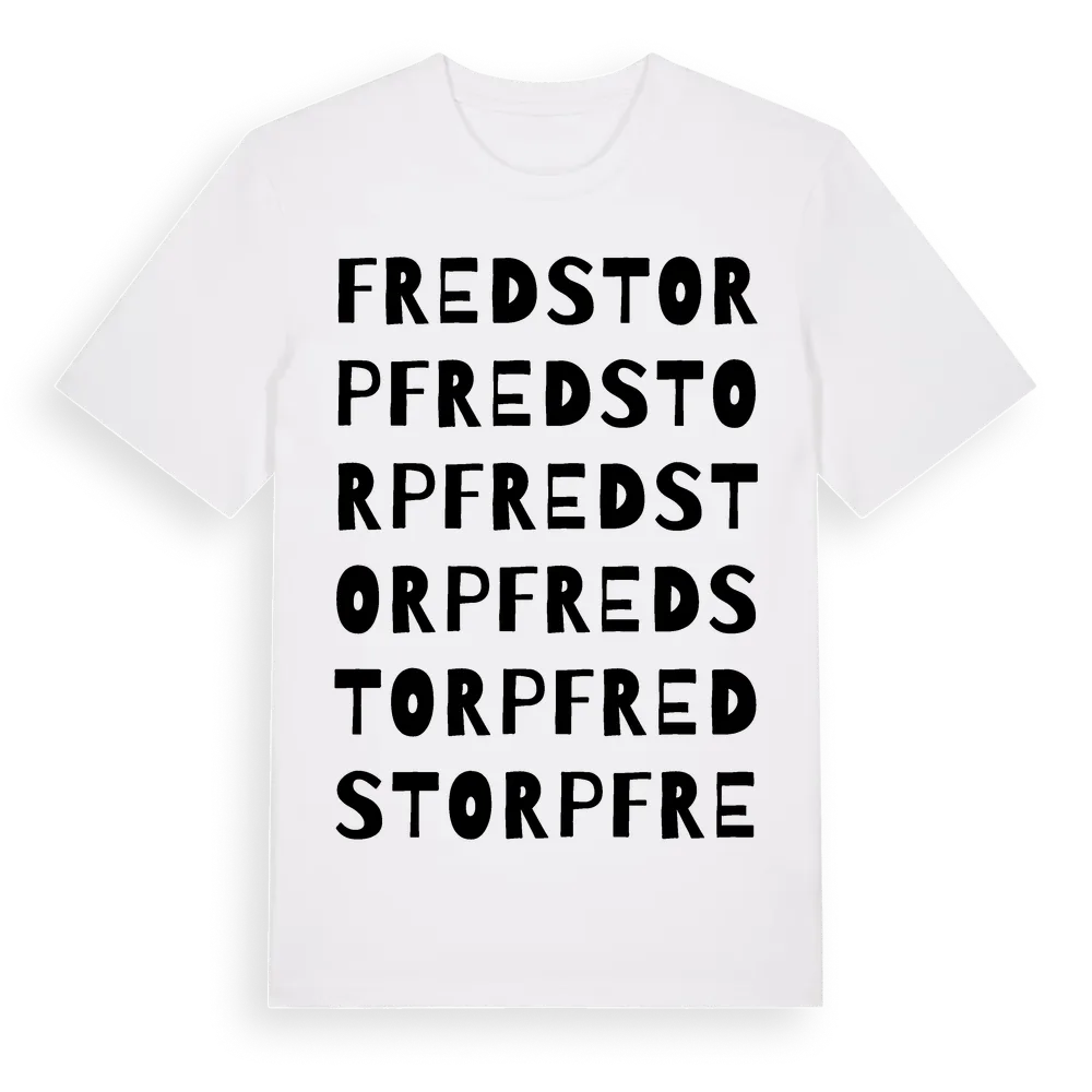 En ordlek byggd på Fredstorps namn. Subtilt och klurig – ett motiv som bara de som verkligen känner platsen fullt ut förstår. Premium bomull, unisex – från Fredstorp i Västra Götalands län.