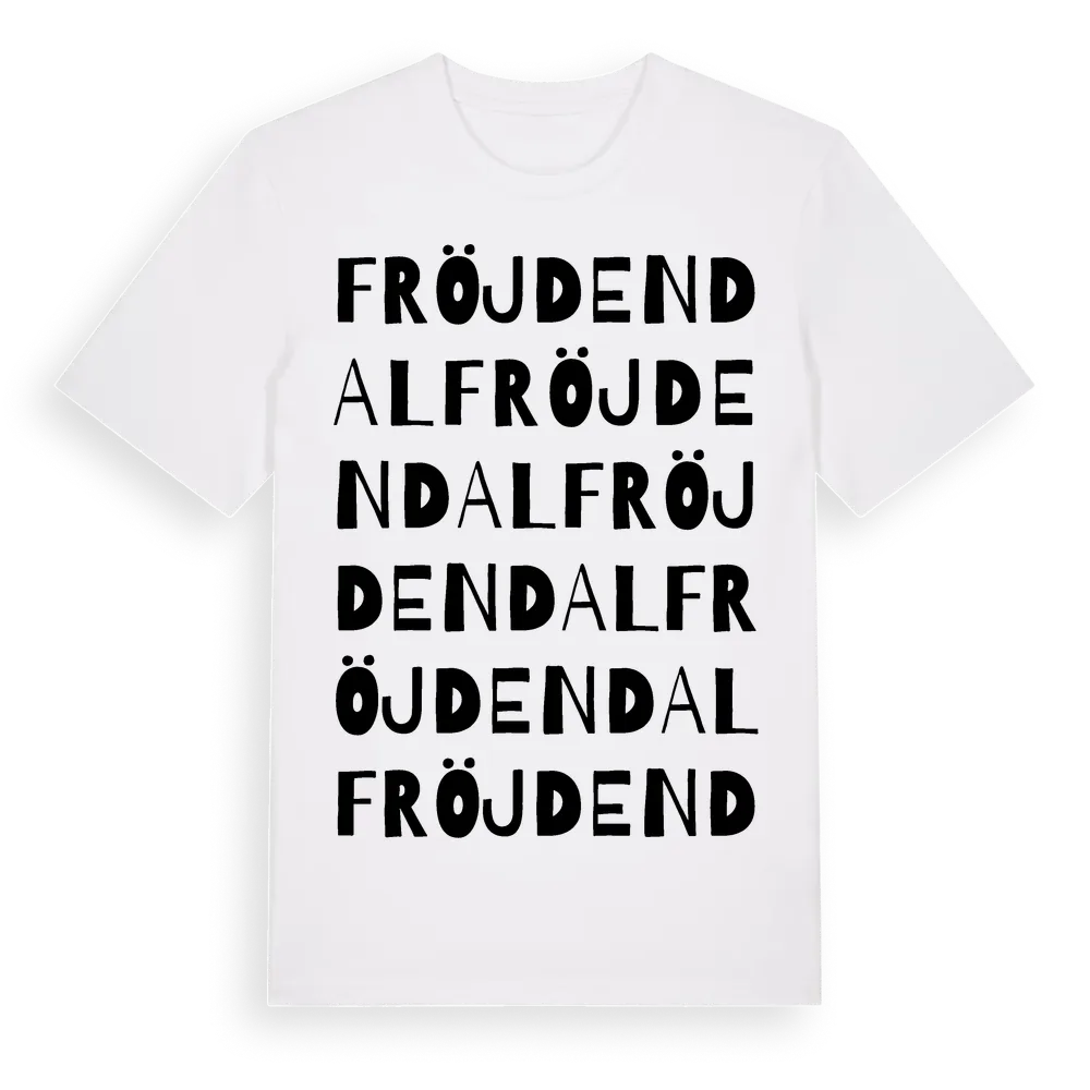 Fröjdendal ordlek t-shirt är inspirerad av Fröjdendal i Västra Götalands län, Sverige. Tröjan är designad för dig som har en speciell koppling till platsen – oavsett om du bor här, har rötterna här eller bara älskar Fröjdendal.