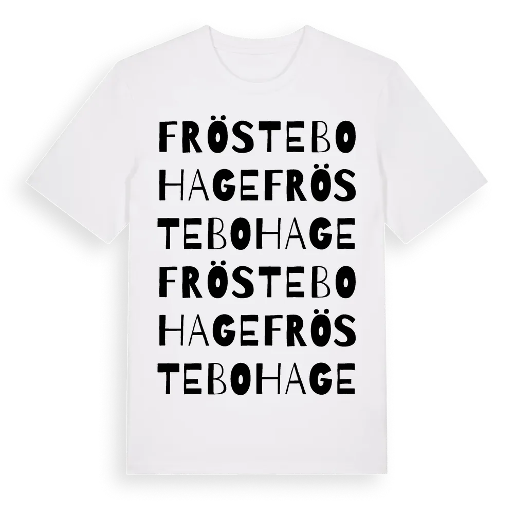 Fröstebo Hage ordlek t-shirt är inspirerad av byn Fröstebo Hage i Västra Götalands län, Sverige. Tröjan är designad för dig som har en speciell koppling till platsen – oavsett om du bor här, har rötterna här eller bara älskar Fröstebo Hage.
