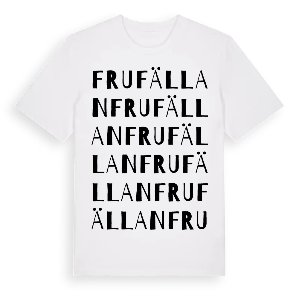 Frufällan ordlek t-shirt är inspirerad av byn Frufällan i Västra Götalands län, Sverige. Tröjan är designad för dig som har en speciell koppling till platsen – oavsett om du bor här, har rötterna här eller bara älskar Frufällan.